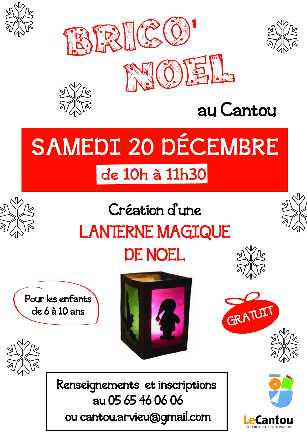 10h à 11h30 – Au Cantou. Atelier créations d’une lanterne de Noël avec Manon. Gratuit. Pour les 6/10 ans. Informations au 05 65 46 06 06.
